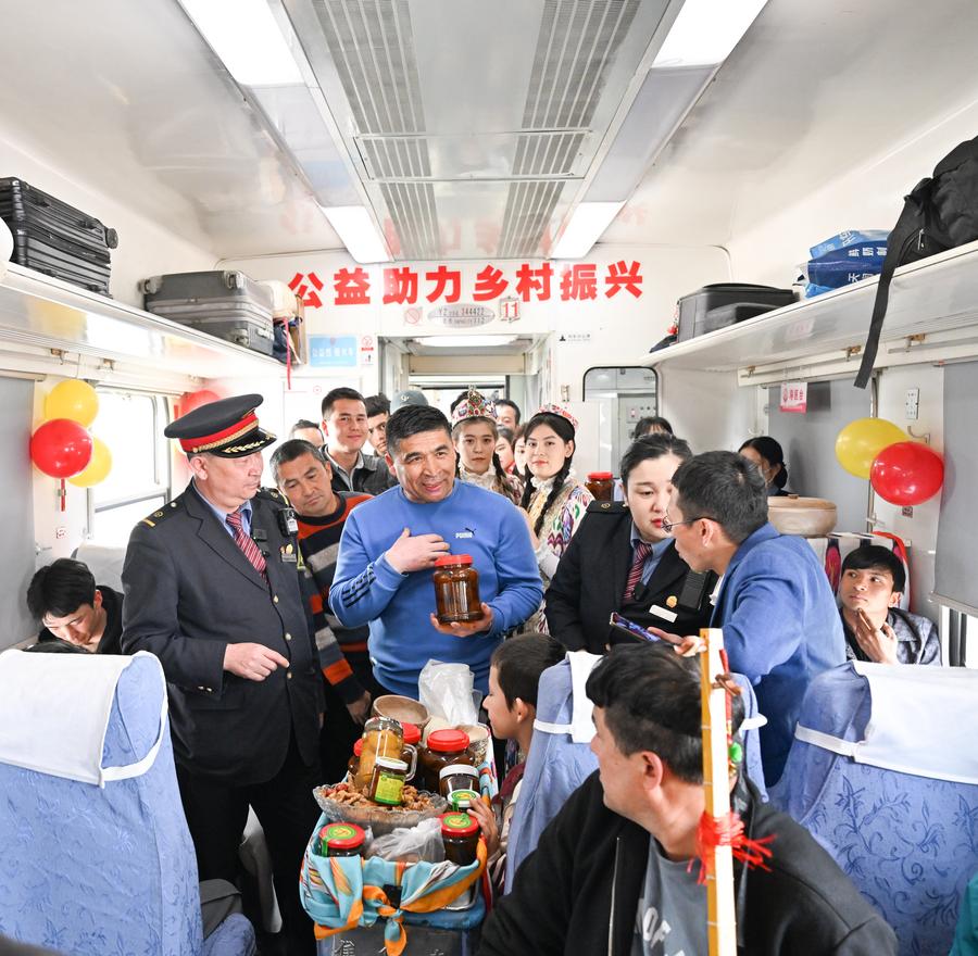 Unlike big city high-speed trains that restrict strong odors, the slow train in Xinjiang has since 2021 provided passengers with a unique feast of smells -- as farmers living along the railway selling local specialties such as fruits, flowers, yogurt and kebabs are allowed to move between carriages, thereby creating a pathway out of poverty for locals.
