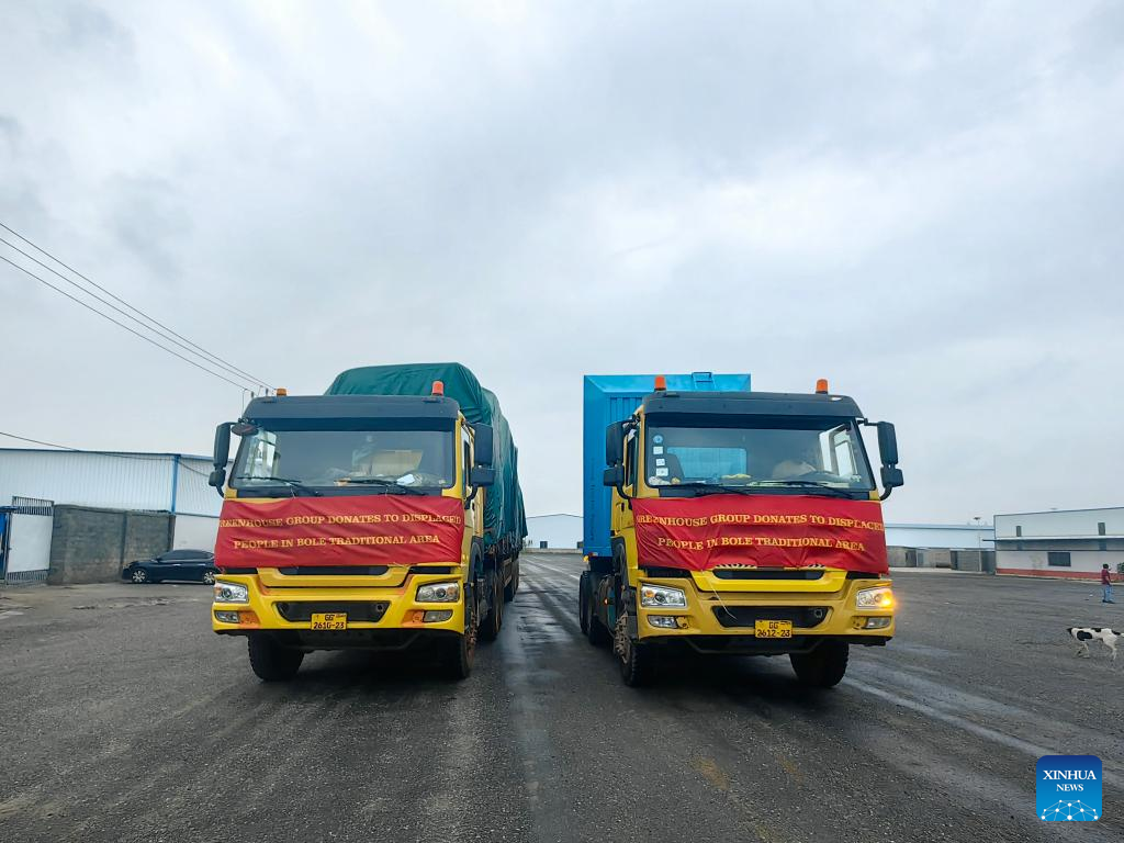 This photo taken on Sept. 13, 2025 shows two trucks loaded with relief supplies donated by the Chinese communities in Ghana in Accra, Ghana. Chinese communities in Ghana have donated relief supplies worth more than 2 million cedis (about 163,000 U.S. dollars) to victims of the recent violent conflict in the country's Savannah Region.(Greenhouse International Development Group Ghana Limited/Handout via Xinhua)