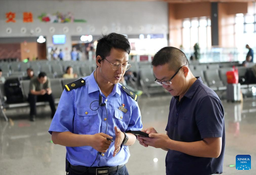 A staff member helps a passenger at Pu'er Railway Station in Pu'er City, southwest China's Yunnan Province, Sept. 20, 2025. As of Sept. 20, the China-Laos Railway has transported more than 59 million passengers since its opening in December 2021, according to China Railway Kunming Group Co., Ltd. (Xinhua/Xing Guangli)