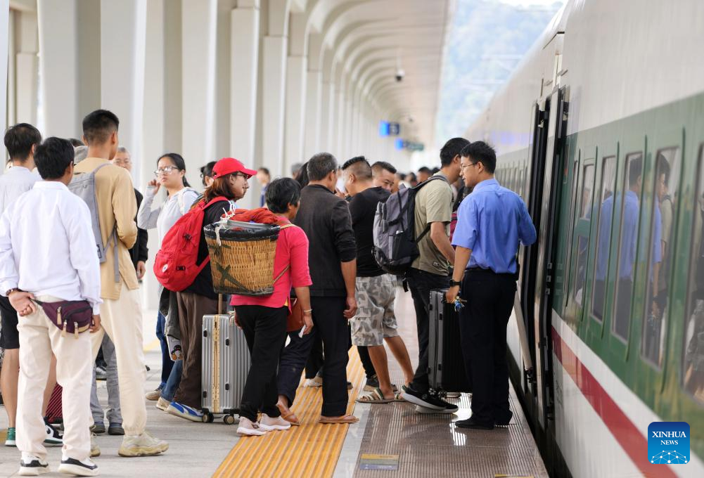 Passengers board a train at Pu'er Railway Station in Pu'er City, southwest China's Yunnan Province, Sept. 20, 2025. As of Sept. 20, the China-Laos Railway has transported more than 59 million passengers since its opening in December 2021, according to China Railway Kunming Group Co., Ltd. (Xinhua/Xing Guangli)
