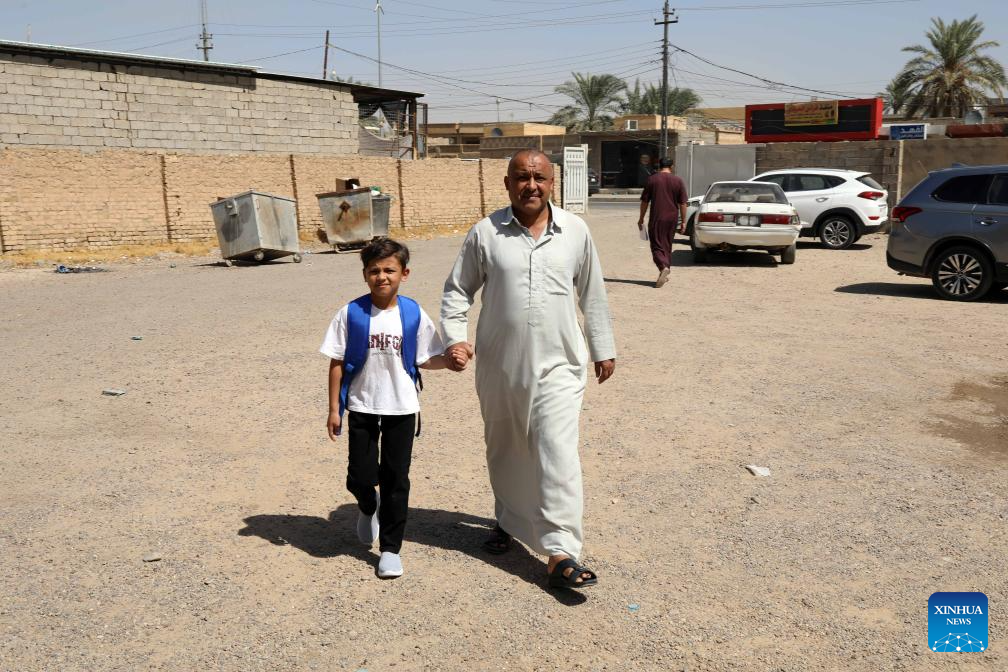 A boy goes to school accompanied by his father in Baghdad, Iraq, on Sept. 21, 2025. The new academic school year started on Sunday in Iraq. (Xinhua/Khalil Dawood)
