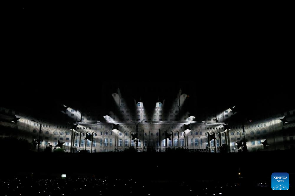 A 3D projection is seen during the iMapp Bucharest 2025, on the facade of the Parliament Palace, in Bucharest, Romania, Sept. 20, 2025. (Photo by Cristian Cristel/Xinhua)