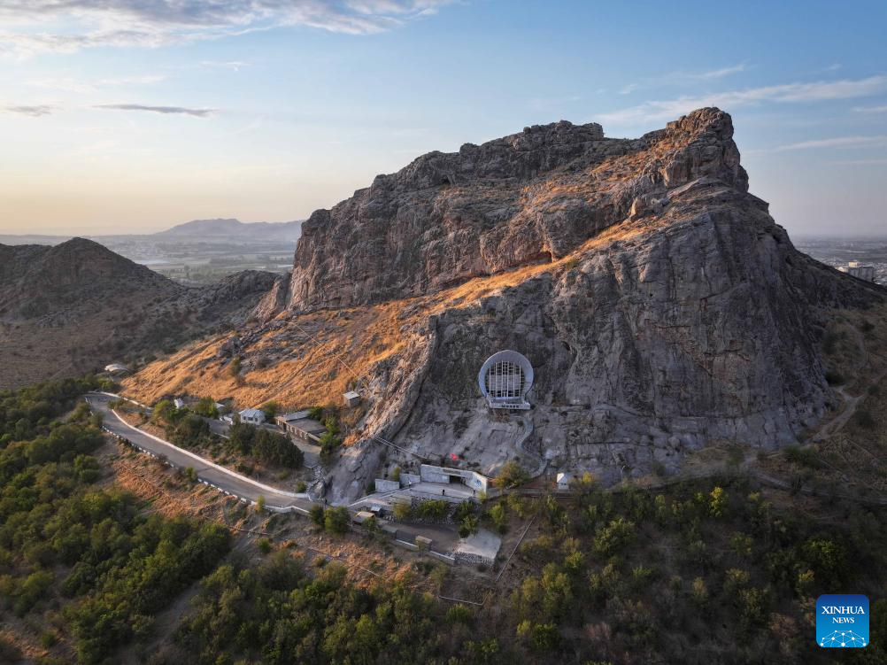 An aerial drone photo taken on Sept. 19, 2025 shows the Sulaiman-Too Mountain in Osh, Kyrgyzstan.