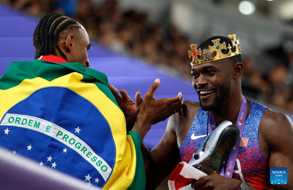 Gold medalist Rai Benjamin (R) of the United States greets silver medalist Alison Dos Santos of Brazil after the men's 400m hurdles final at the 2025 World Athletics Championships in Tokyo, Japan, Sept. 19, 2025. (Xinhua/Wang Lili)