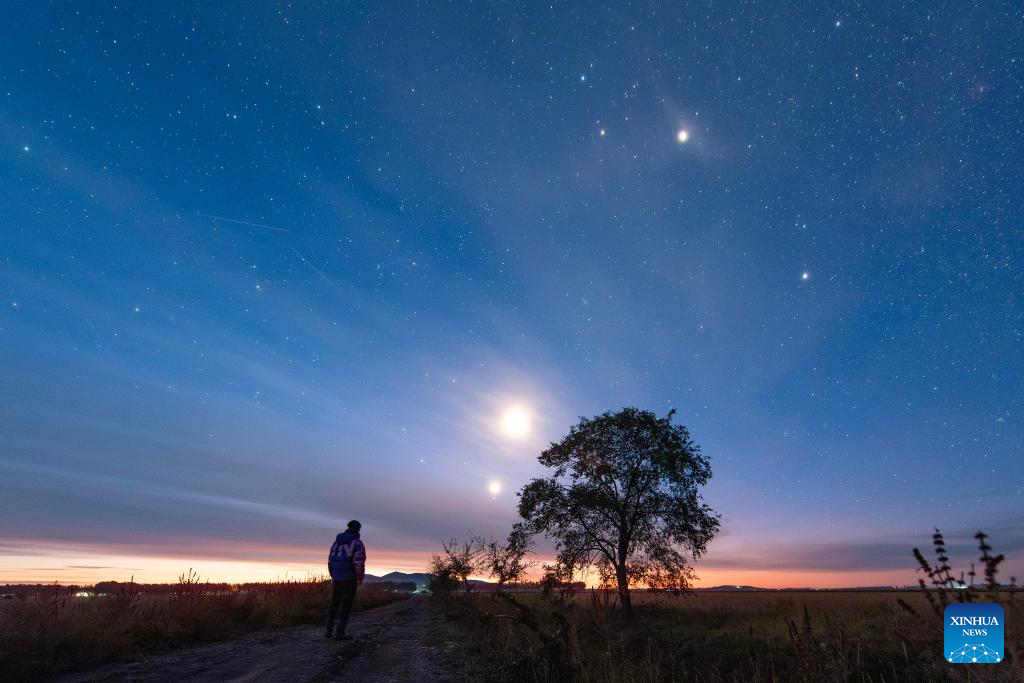 This photo taken on Sept. 19, 2025 shows the planet of Venus, the star of Regulus in the constellation Leo and a crescent moon in the sky over Fujin City of Jiamusi, northeast China's Heilongjiang Province. (Photo by Qu Yubao/Xinhua)