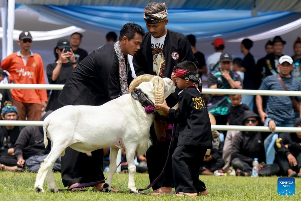 People prepare a ram prior to a traditional ram fighting, which is part of the Sundanese culture, in Bogor, West Java, Indonesia, Sept. 20, 2025. (Photo by Sandika Fadilah/Xinhua)