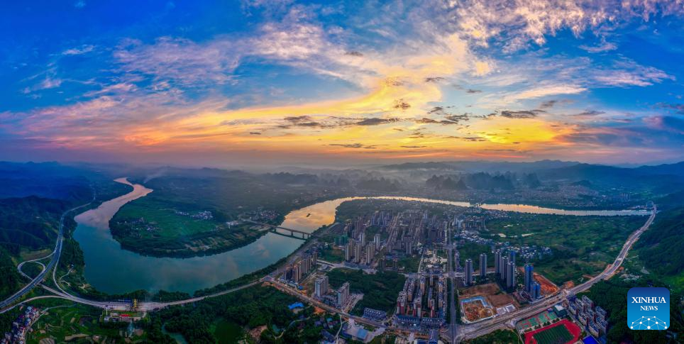 An aerial drone photo taken on Sept. 19, 2025 shows the Rongjiang River at sunset in Rongshui Miao Autonomous County of Liuzhou City, south China's Guangxi Zhuang Autonomous Region. (Photo by Long Tao/Xinhua)