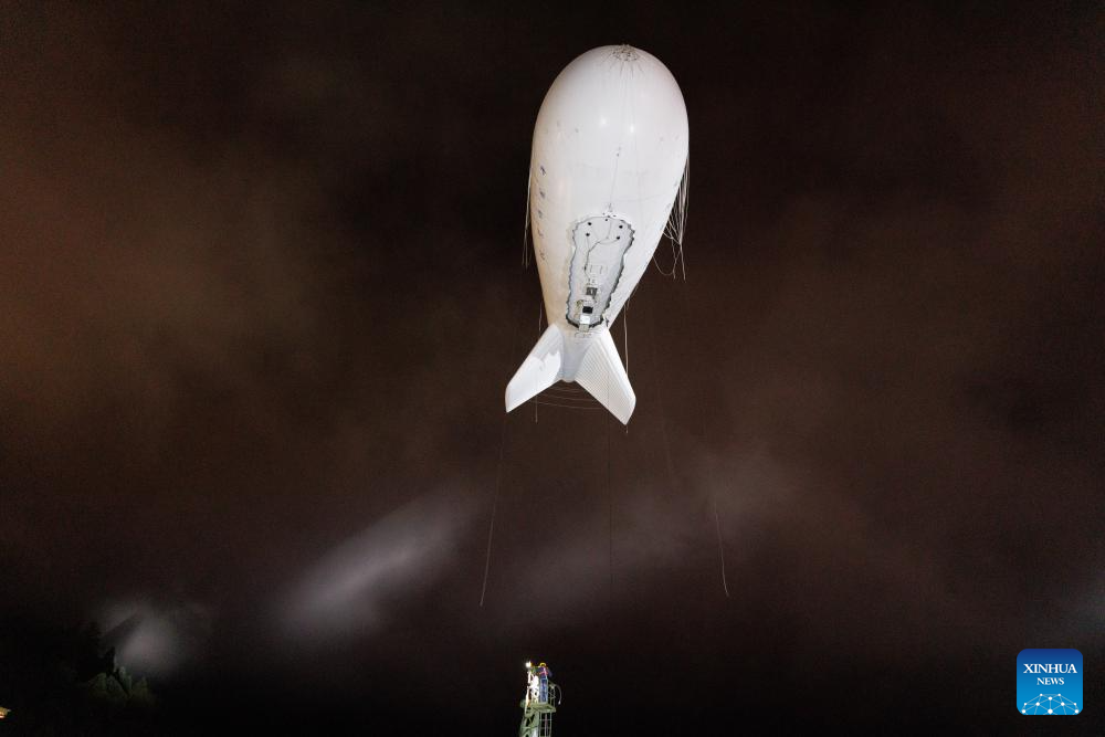 "Jimu-1" tethered balloon hovers above the ground in Lulang, Nyingchi, southwest China's Xizang Autonomous Region, Sept. 18, 2025.