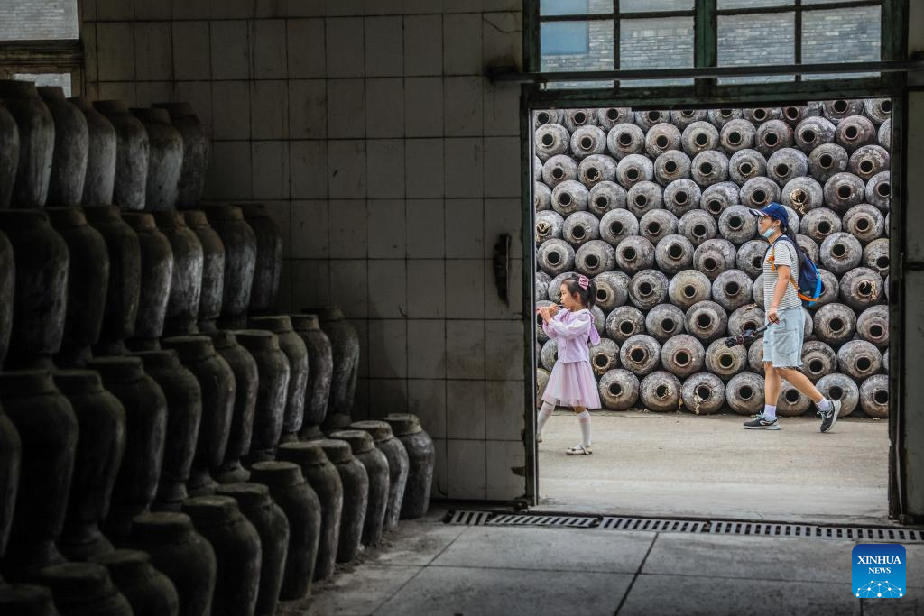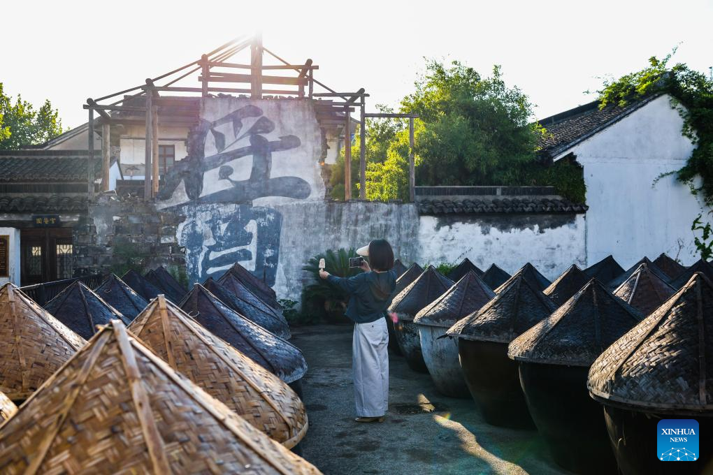 A visitor takes photos at Shendang Winery Co., Ltd. in Haiyan County of Jiaxing City, east China's Zhejiang Province on Sept. 19, 2025. Shendang Town has been developing a distinctive cultural and tourism route with its own features, making the town a highly sought-after tourist destination in the Yangtze River Delta region since 2024. It has integrated its most distinctive culture, intangible cultural heritages, landmarks, and surrounding cultural tourism projects with the characteristics of the town, offering visitors exceptional cultural and tourism experiences.