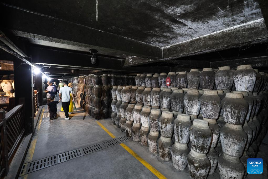 People tour the underground wine cellar of Shendang Winery Co., Ltd. in Haiyan County of Jiaxing City, east China's Zhejiang Province on Sept. 20, 2025. Shendang Town has been developing a distinctive cultural and tourism route with its own features, making the town a highly sought-after tourist destination in the Yangtze River Delta region since 2024. It has integrated its most distinctive culture, intangible cultural heritages, landmarks, and surrounding cultural tourism projects with the characteristics of the town, offering visitors exceptional cultural and tourism experiences.