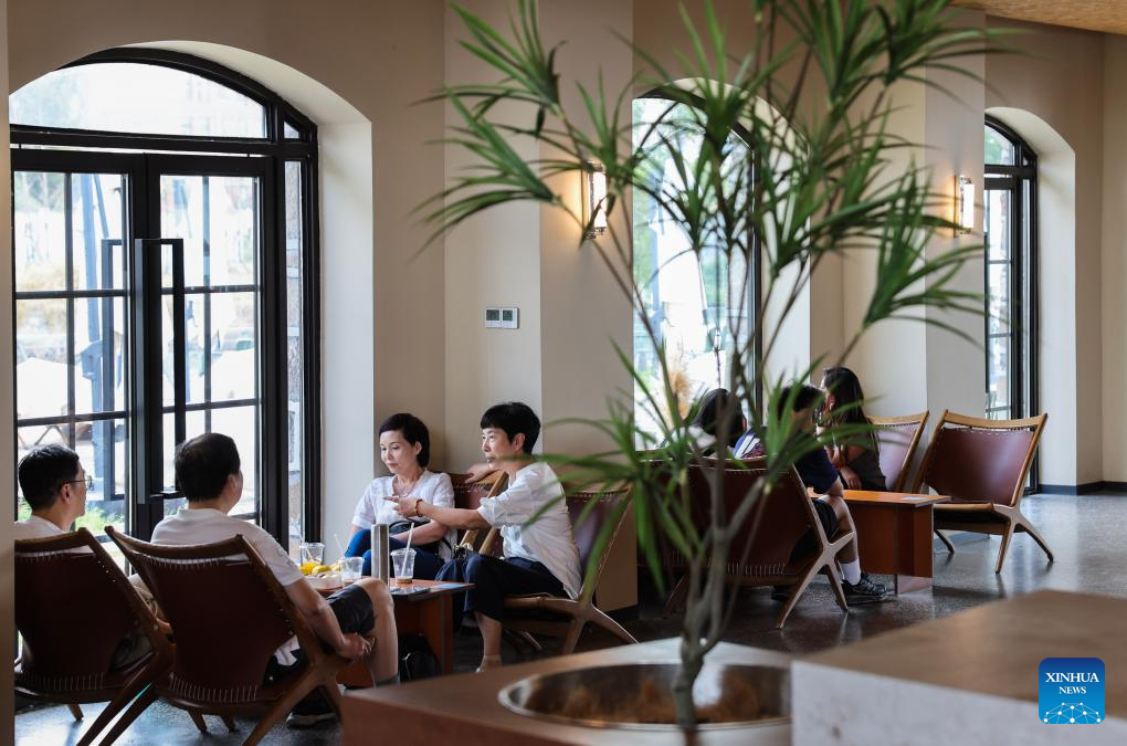People visit a cafe in a barn-modified cultural industrial park in Shendang Town in Haiyan County, Jiaxing City, east China's Zhejiang Province, Sept. 19, 2025. Shendang Town has been developing a distinctive cultural and tourism route with its own features, making the town a highly sought-after tourist destination in the Yangtze River Delta region since 2024. It has integrated its most distinctive culture, intangible cultural heritages, landmarks, and surrounding cultural tourism projects with the characteristics of the town, offering visitors exceptional cultural and tourism experiences.
