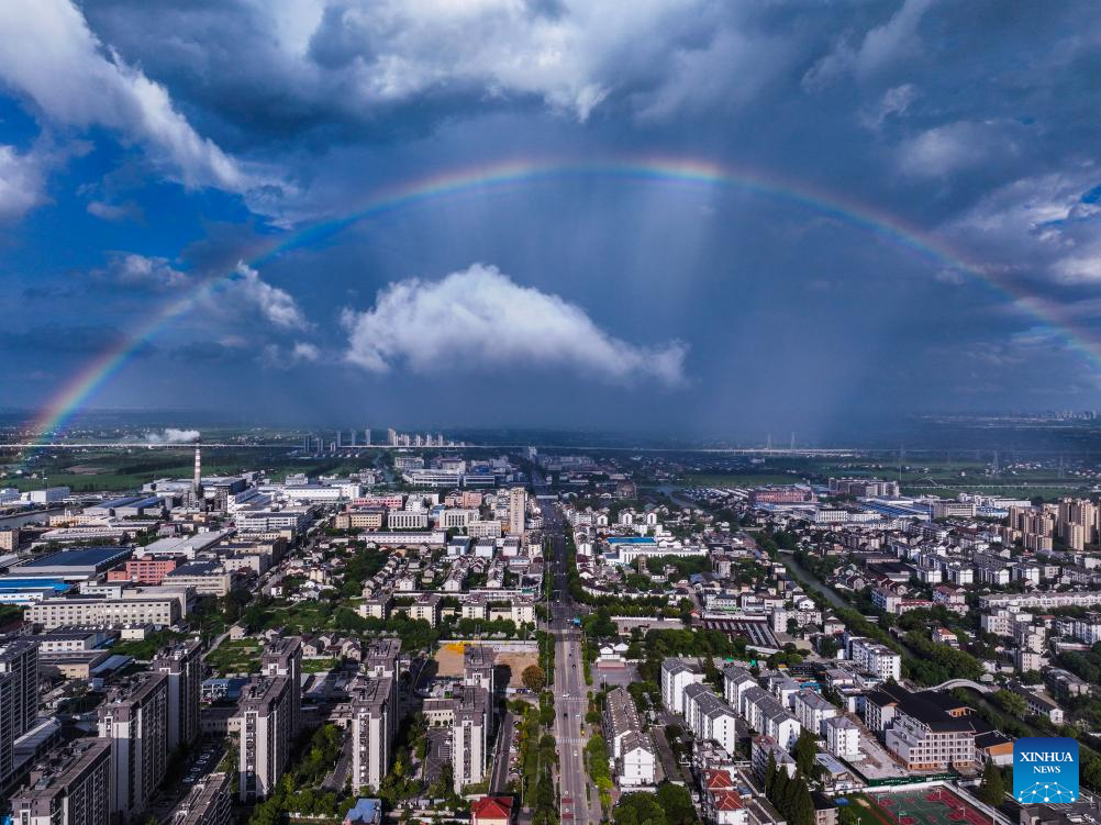 An aerial drone photo taken on Sept. 19, 2025 shows a rainbow in the sky above Shendang Town in Haiyan County, Jiaxing City, east China's Zhejiang Province. Shendang Town has been developing a distinctive cultural and tourism route with its own features, making the town a highly sought-after tourist destination in the Yangtze River Delta region since 2024. It has integrated its most distinctive culture, intangible cultural heritages, landmarks, and surrounding cultural tourism projects with the characteristics of the town, offering visitors exceptional cultural and tourism experiences.