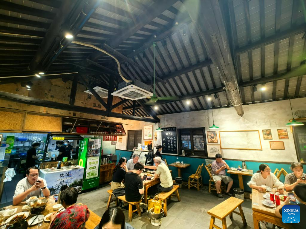 People have dinner at a restaurant mentioned in a novel written by renowned Chinese contemporary writer Yu Hua, in Shendang Town of Jiaxing City, east China's Zhejiang Province on Sept. 19, 2025. Shendang Town has been developing a distinctive cultural and tourism route with its own features, making the town a highly sought-after tourist destination in the Yangtze River Delta region since 2024. It has integrated its most distinctive culture, intangible cultural heritages, landmarks, and surrounding cultural tourism projects with the characteristics of the town, offering visitors exceptional cultural and tourism experiences.