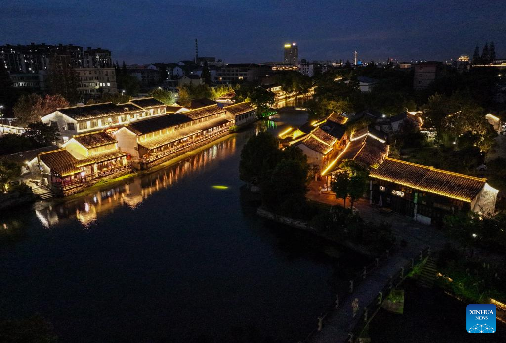 An aerial drone photo taken on Sept. 19, 2025 shows a night view of Shendang Town in Haiyan County, Jiaxing City, east China's Zhejiang Province. Shendang Town has been developing a distinctive cultural and tourism route with its own features, making the town a highly sought-after tourist destination in the Yangtze River Delta region since 2024. It has integrated its most distinctive culture, intangible cultural heritages, landmarks, and surrounding cultural tourism projects with the characteristics of the town, offering visitors exceptional cultural and tourism experiences.