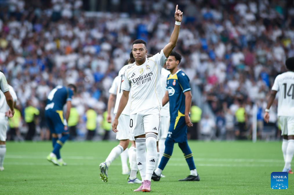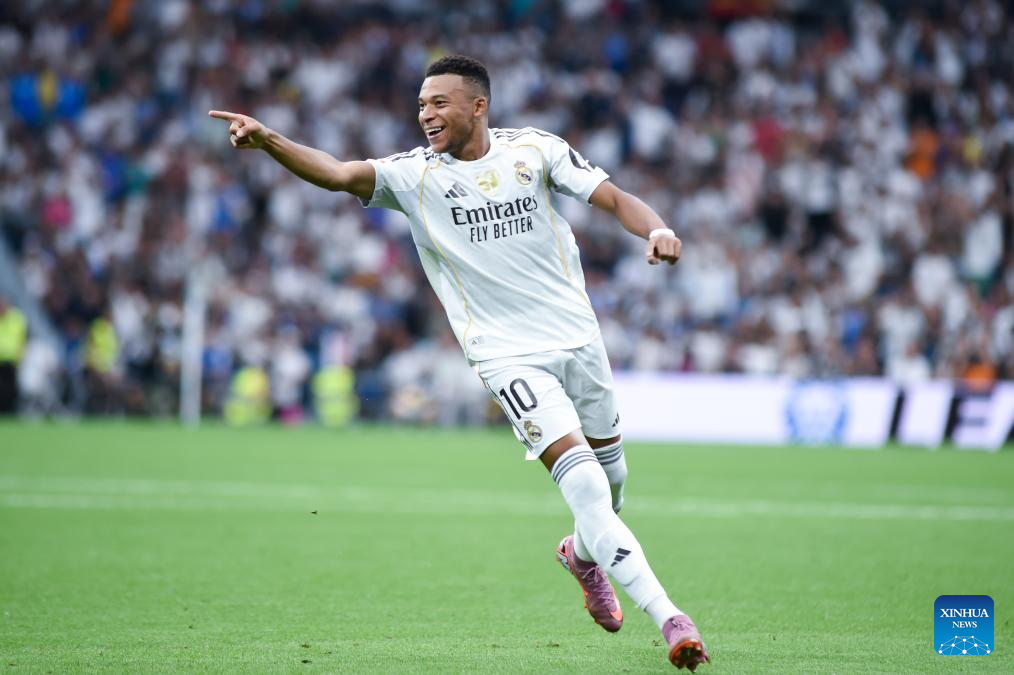 Kylian Mbappe of Real Madrid celebrates a goal during the La Liga football match between Real Madrid and RCD Espanyol in Santiago Bernabeu Stadium, Madrid, Spain, Sept. 20, 2025. (Photo by Gustavo Valiente/Xinhua)