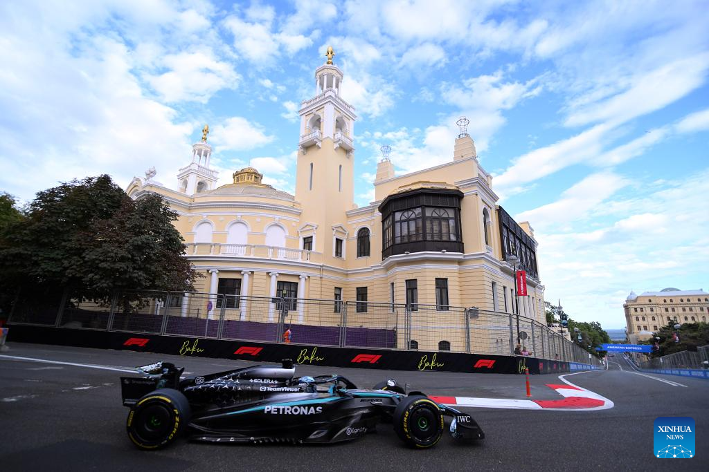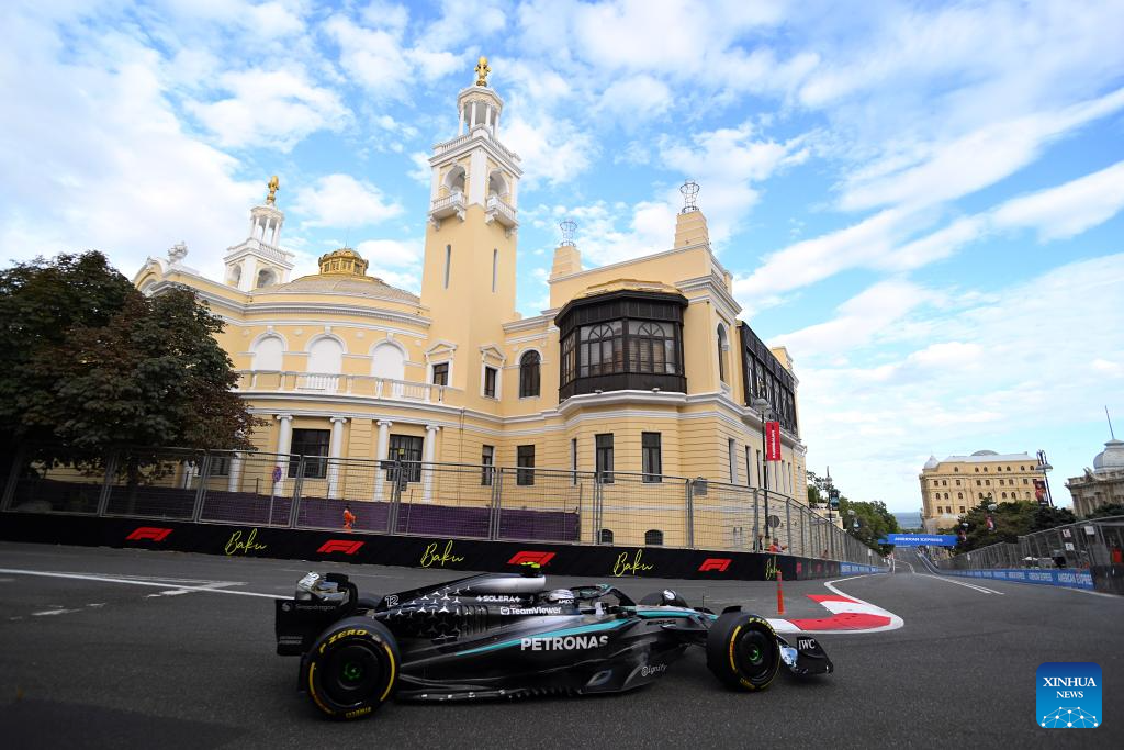 Mercedes' driver George Russell of Britain competes during the qualifying session of the 2025 Formula One Azerbaijan Grand Prix in Baku, Azerbaijan, Sept. 20, 2025. (Photo by Tofik Babayev/Xinhua)