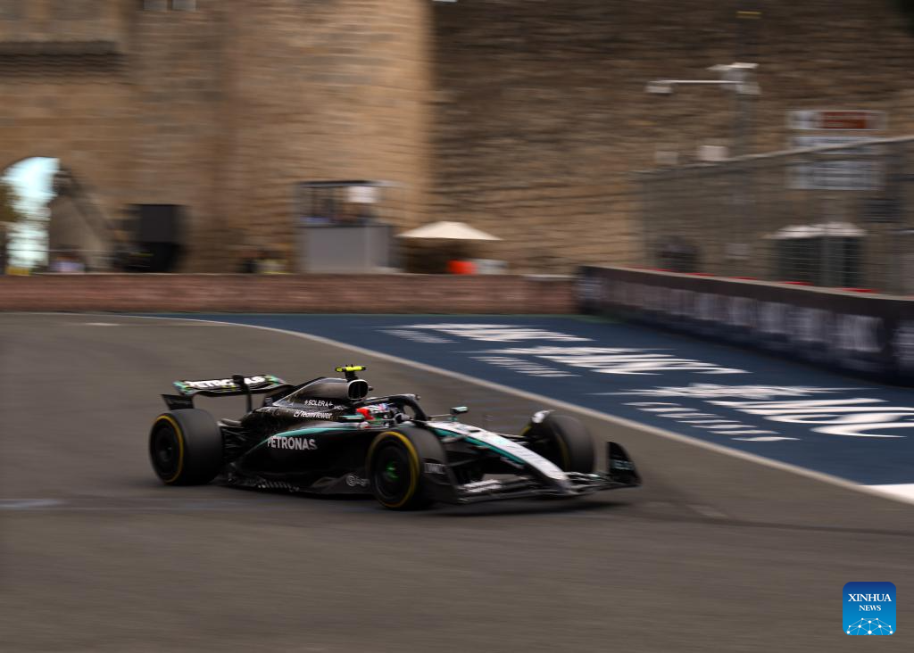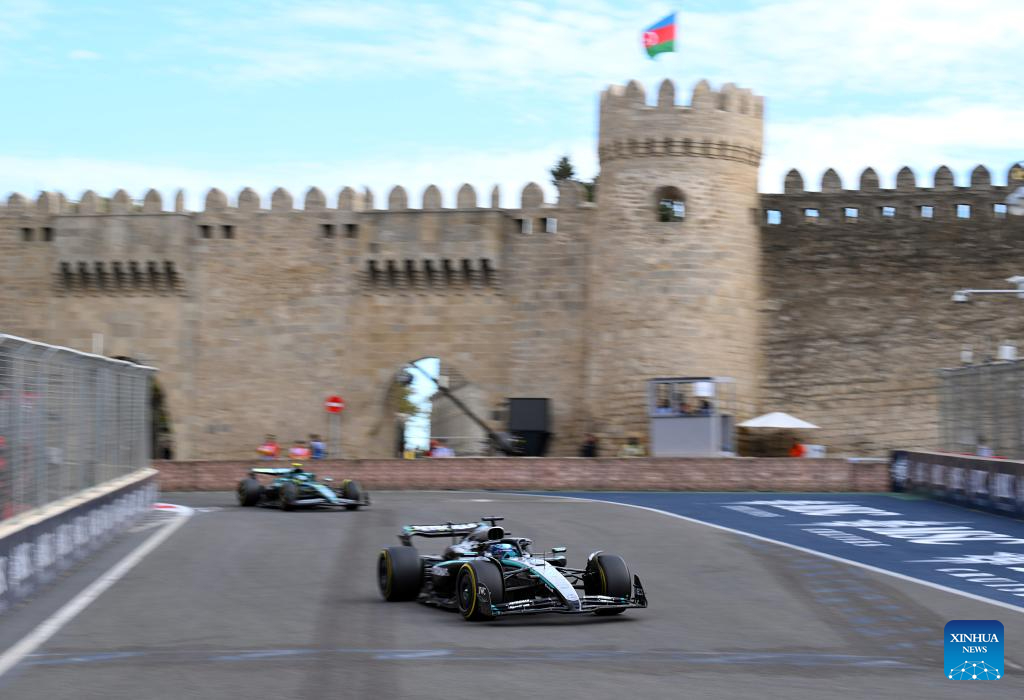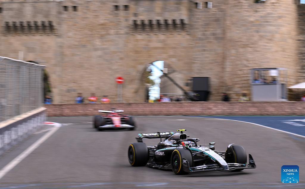Mercedes' driver George Russell (front) of Britain competes during the qualifying session of the 2025 Formula One Azerbaijan Grand Prix in Baku, Azerbaijan, Sept. 20, 2025. (Photo by Tofik Babayev/Xinhua)