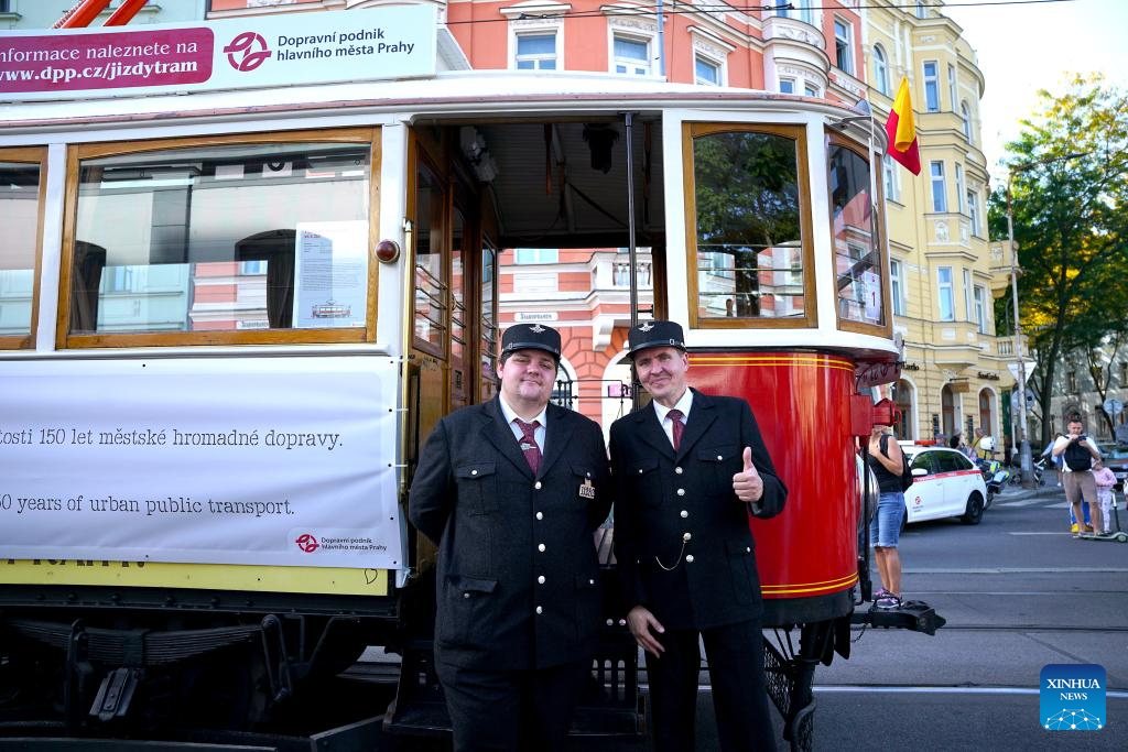 Two tram conductors pose for a photo during a tram parade in Prague, the Czech Republic, on Sept. 21, 2025. A tram parade was held here on Sunday as part of the celebrations to mark 150 years of urban public transport in the Czech capital. (Photo by Dana Kesnerova/Xinhua)
