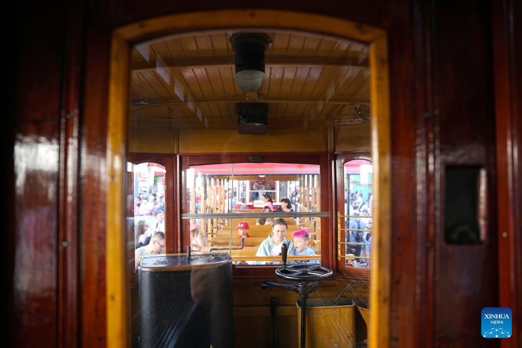 People take a historical tram during a tram parade in Prague, the Czech Republic, on Sept. 21, 2025. A tram parade was held here on Sunday as part of the celebrations to mark 150 years of urban public transport in the Czech capital. (Photo by Dana Kesnerova/Xinhua)