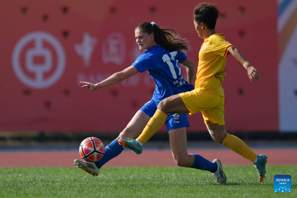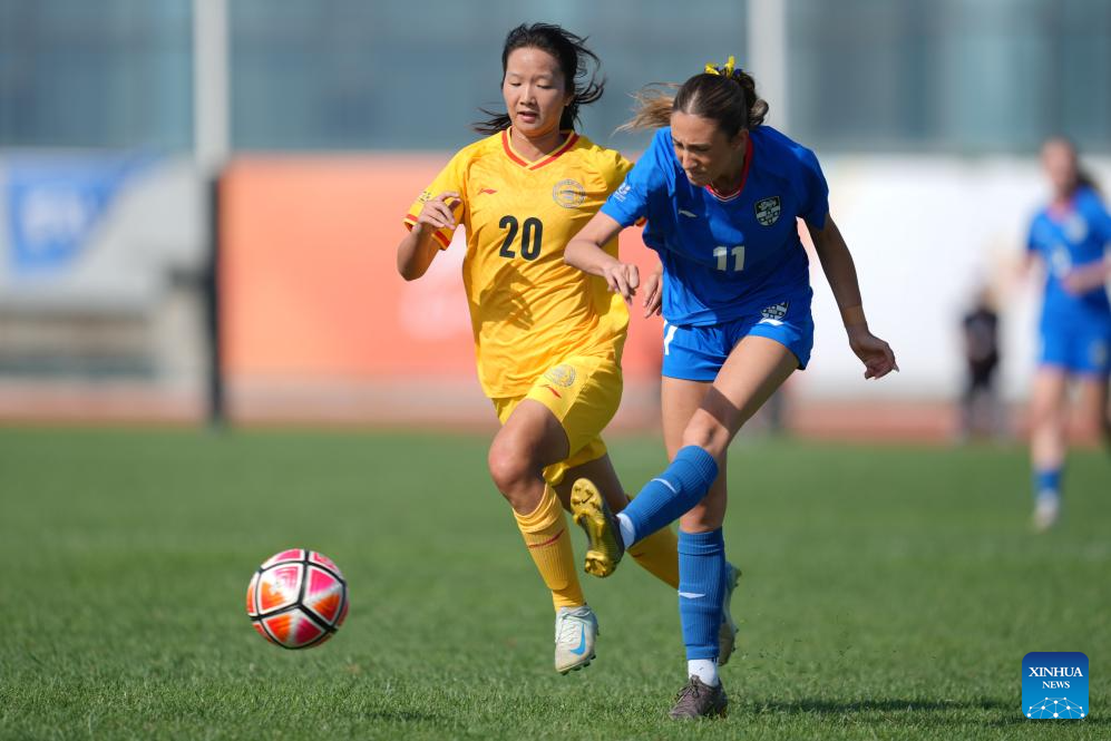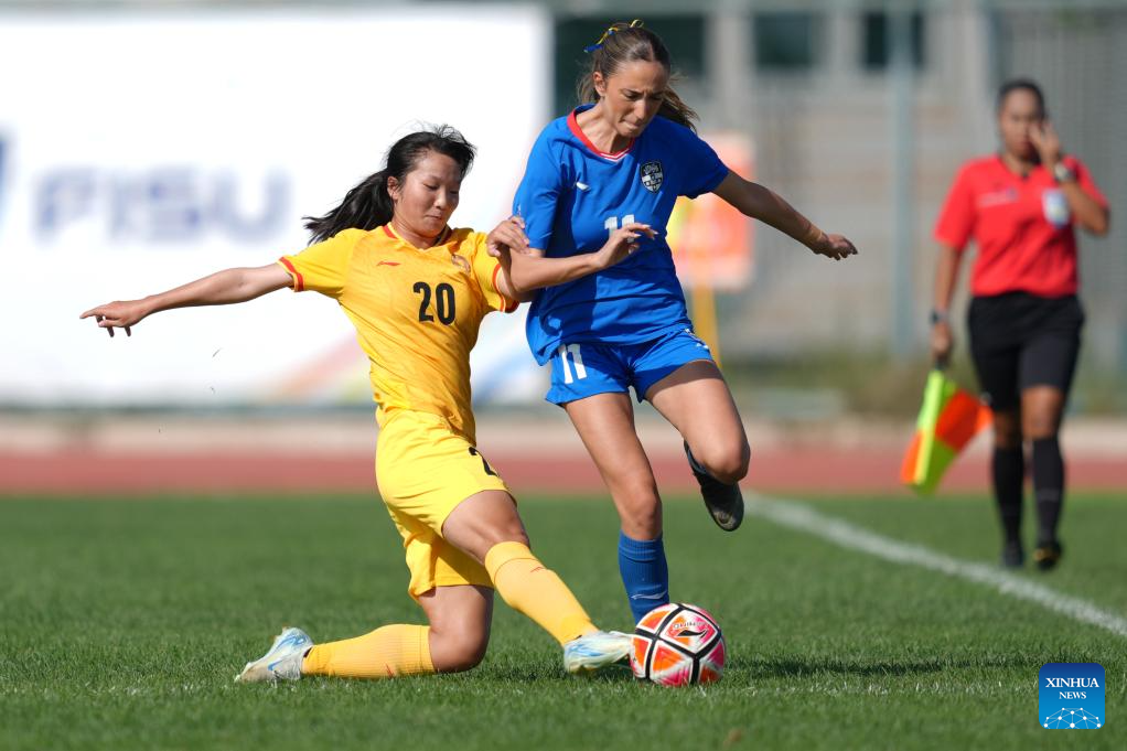 Amelia Poppy Kirby (L) of the University of Sydney competes during the Women's Group B match between Beijing Normal University (CHN) and The University of Sydney (AUS) at 2025 FISU University World Cup Football in Dalian, northeast China's Liaoning Province, on Sept. 21, 2025. (Xinhua/Zheng Huansong)