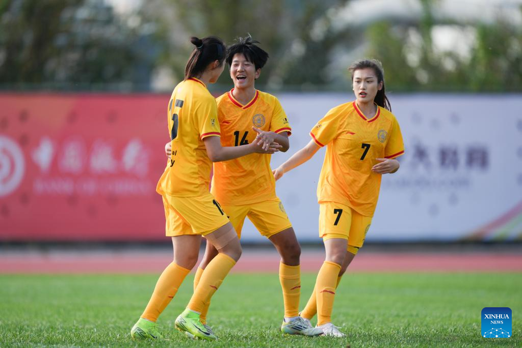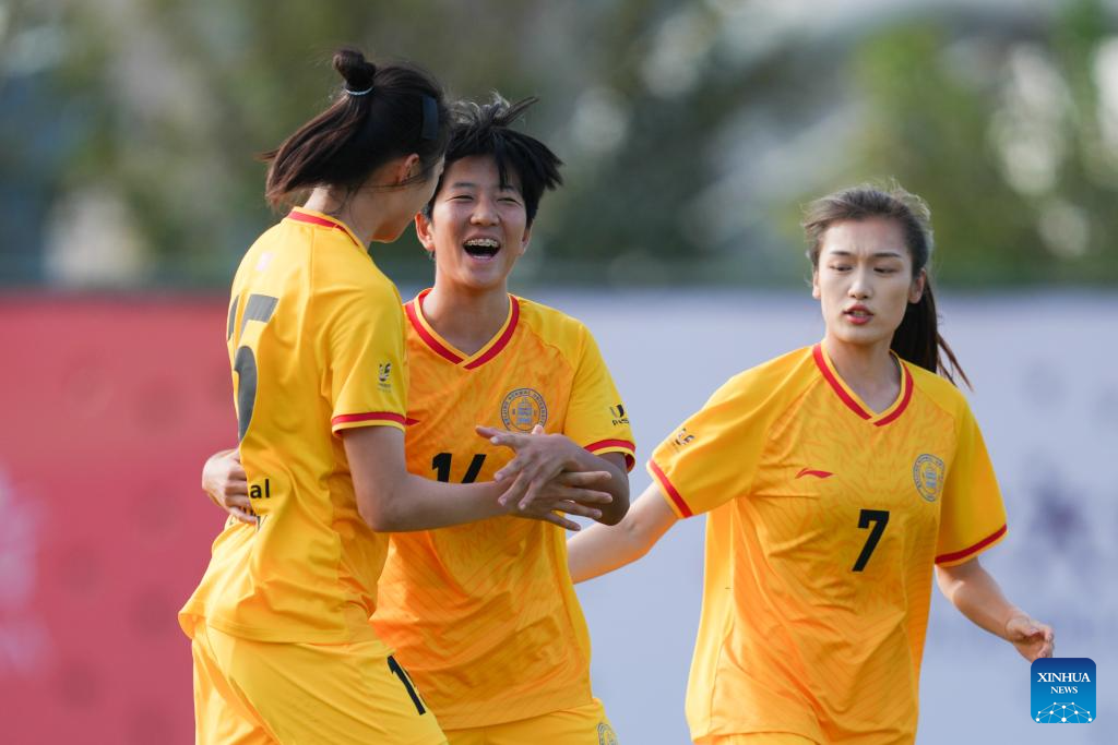 Players of Beijing Normal University celebrate during the Women's Group B match between Beijing Normal University (CHN) and The University of Sydney (AUS) at 2025 FISU University World Cup Football in Dalian, northeast China's Liaoning Province, on Sept. 21, 2025. (Xinhua/Zheng Huansong)