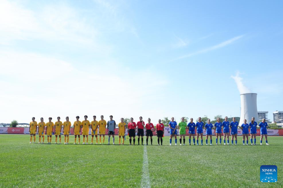 Starting players of both sides and referees line up before the Women's Group B match between Beijing Normal University (CHN) and The University of Sydney (AUS) at 2025 FISU University World Cup Football in Dalian, northeast China's Liaoning Province, on Sept. 21, 2025. (Xinhua/Zheng Huansong)