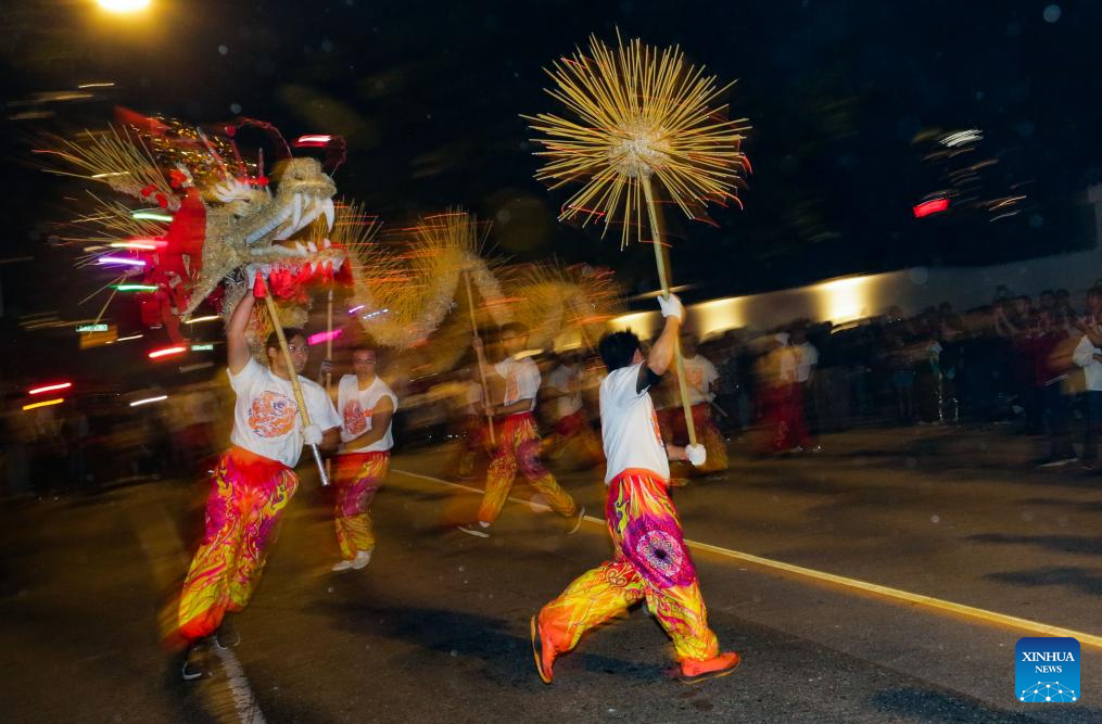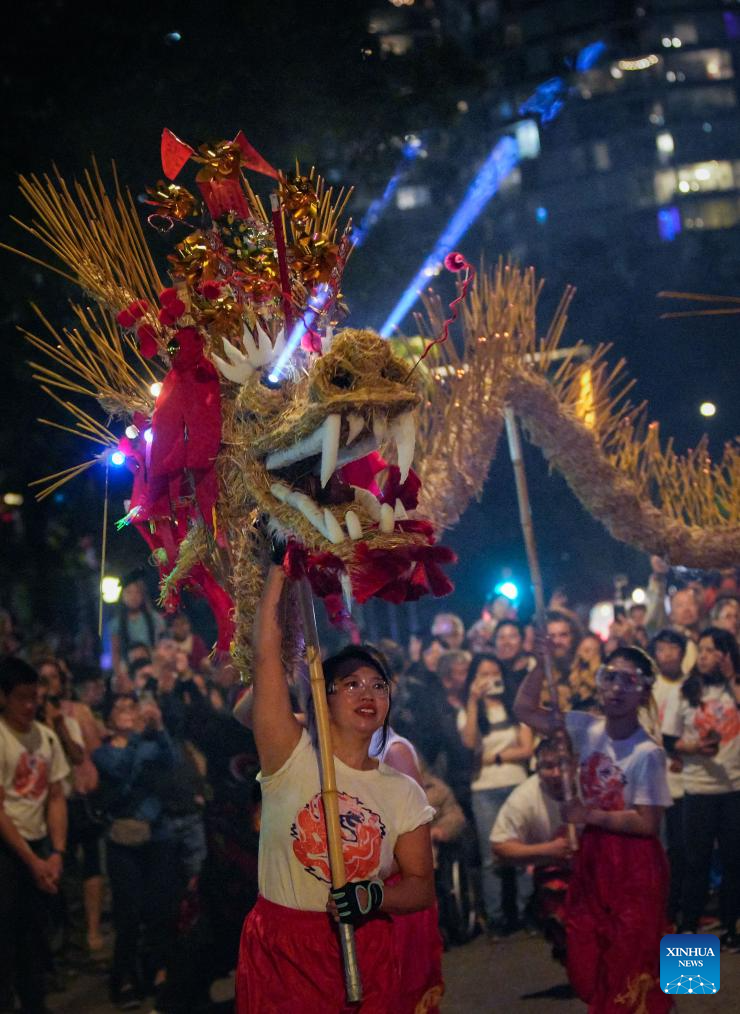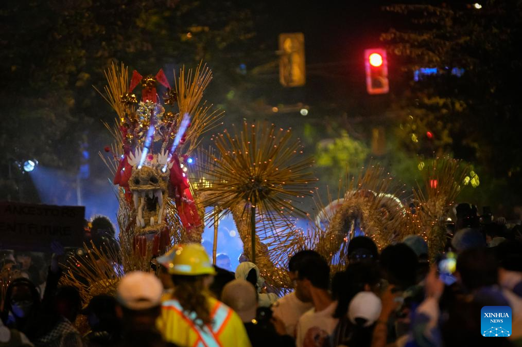People perform a fire dragon dance on a street to celebrate the Fire Dragon Festival in Vancouver, British Columbia, Canada, Sept. 20, 2025. (Photo by Liang Sen/Xinhua)