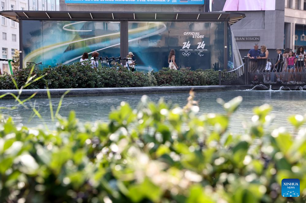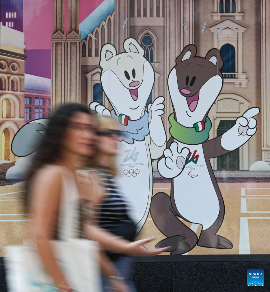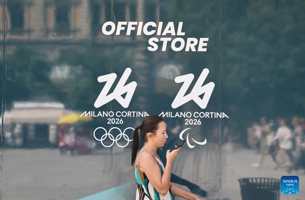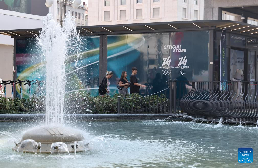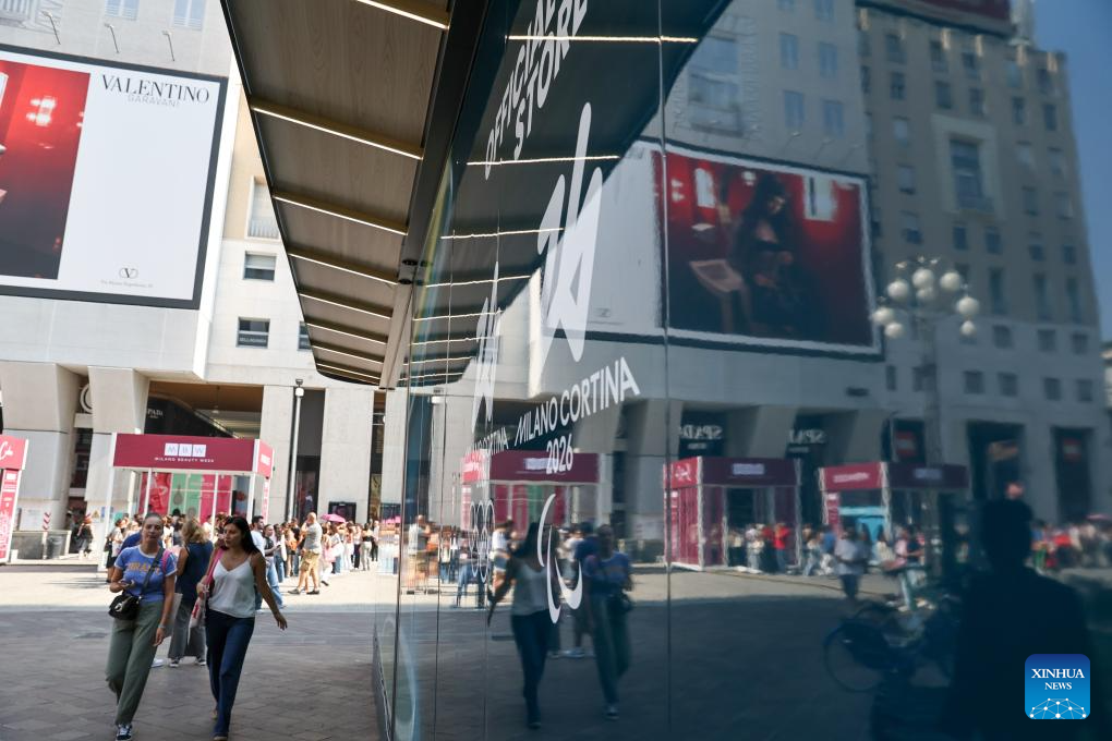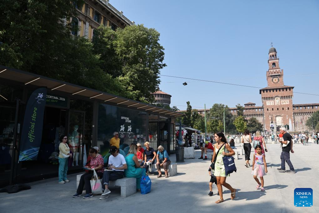 People walk past an official store for Milano Cortina 2026 Olympic and Paralympic Winter Games in Milan, Italy, Sept. 20, 2025. (Xinhua/Li Jing)