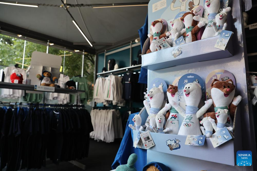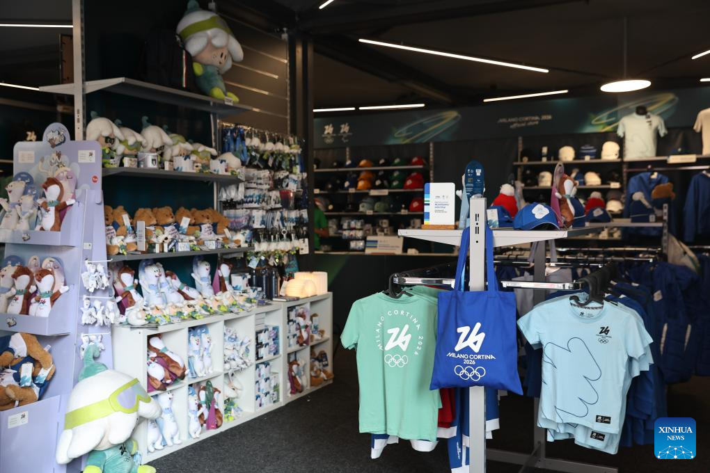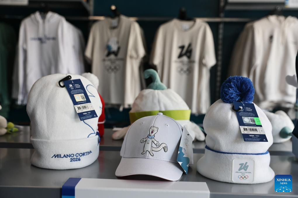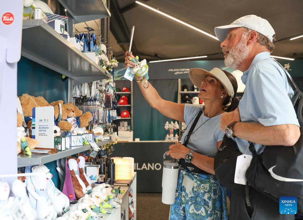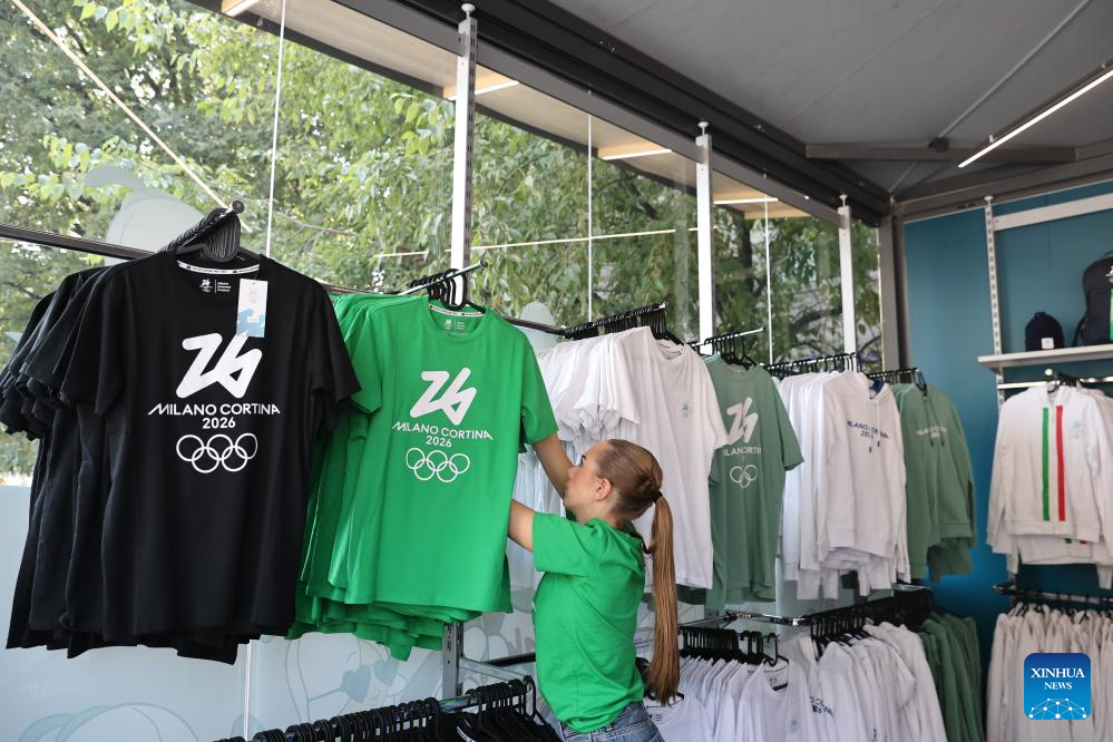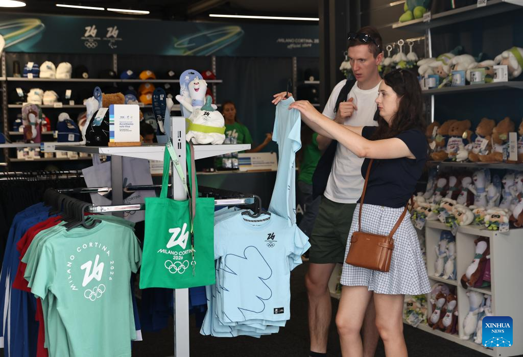 Consumers select products in an official store for Milano Cortina 2026 Olympic and Paralympic Winter Games in Milan, Italy, Sept. 20, 2025. (Xinhua/Li Jing)