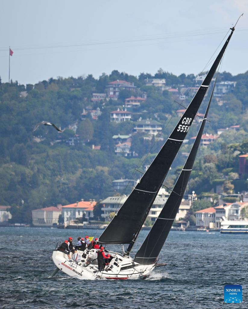 Yacht "Rossko Racer" competes during the 24th Bosphorus Cup sailing event in Istanbul, Türkiye, Sept. 20, 2025. (Xinhua/Liu Lei)