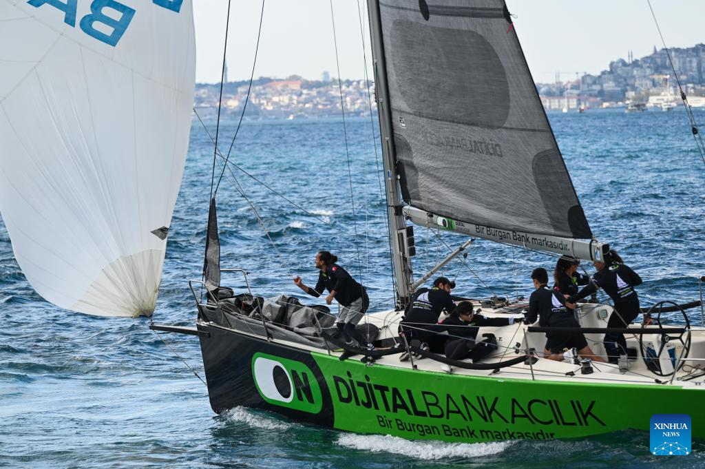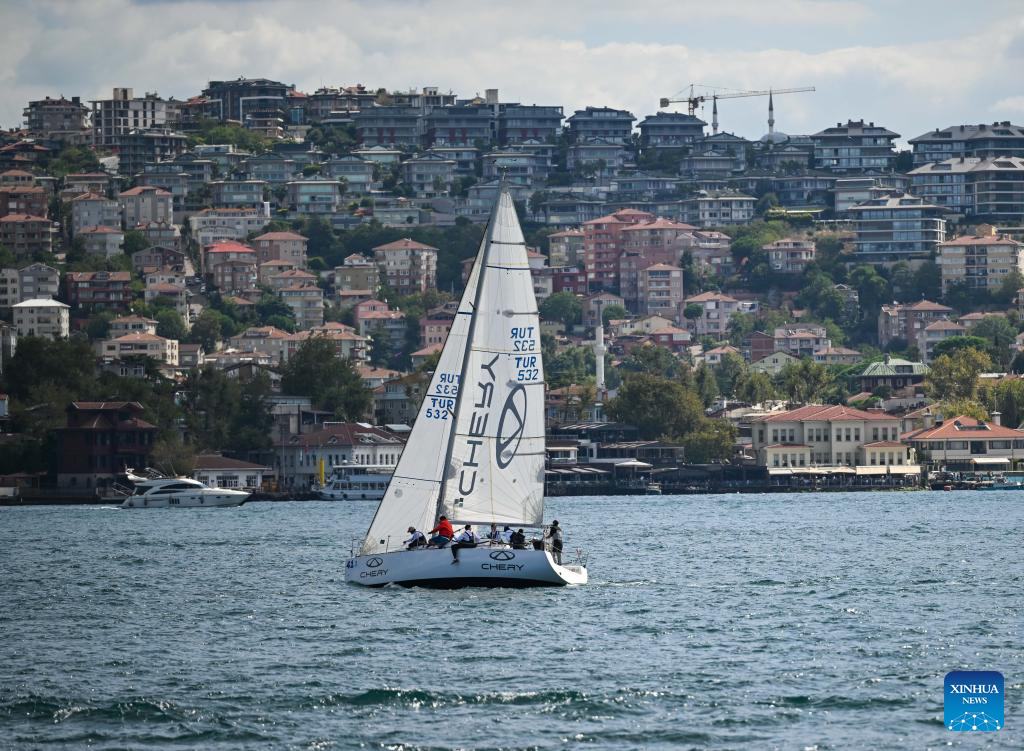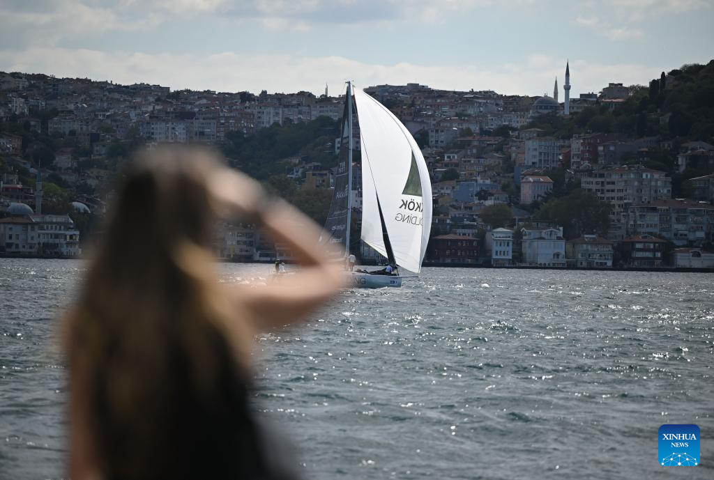 A yacht competes during the 24th Bosphorus Cup sailing event in Istanbul, Türkiye, Sept. 20, 2025. (Xinhua/Liu Lei)