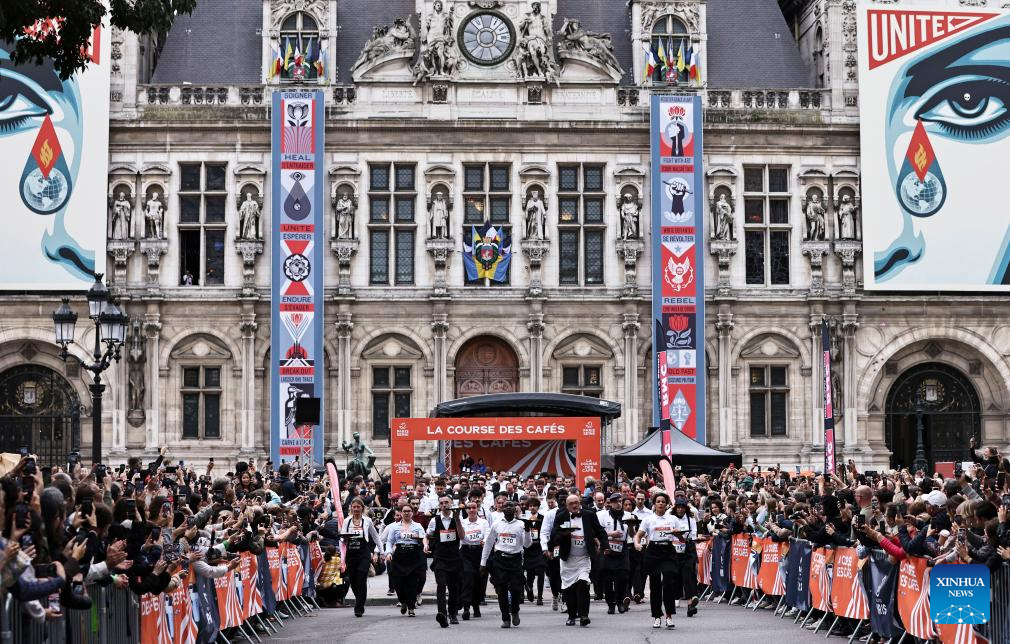 The traditional "Course des cafes," a 4-km race in which competitors carry a tray with water, a coffee cup and a croissant, was held in central Paris on Sunday. (Xinhua/Gao Jing)