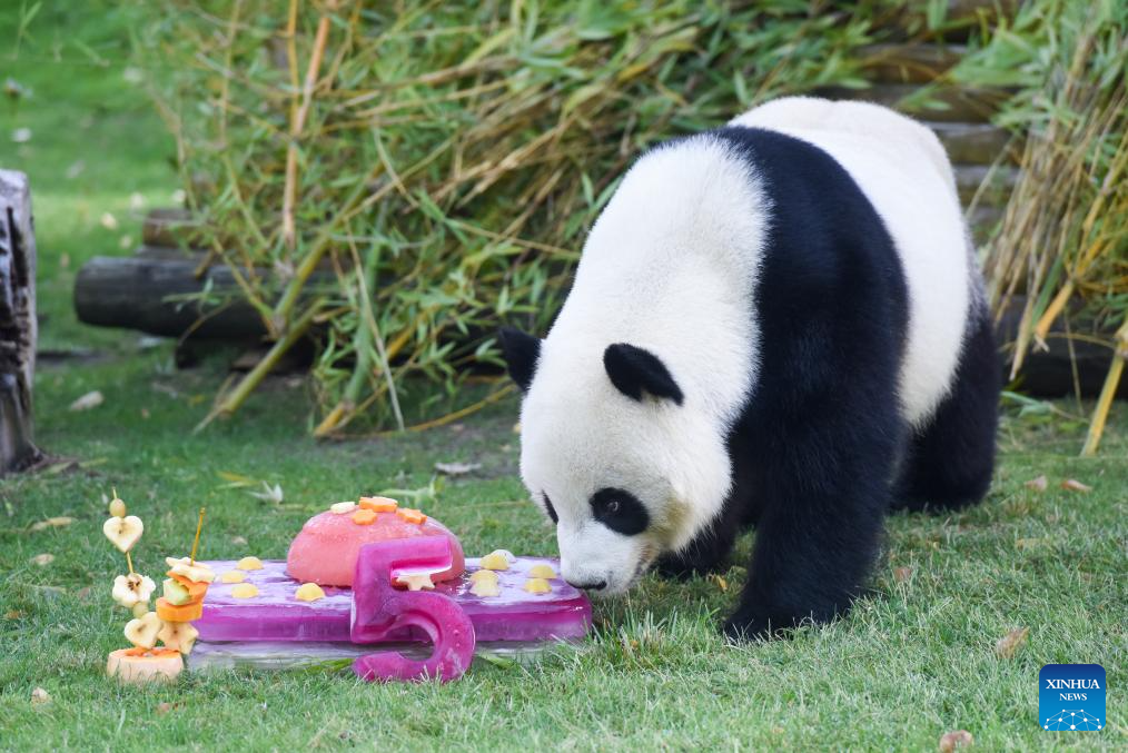 Giant panda Jin Xi sniffs a birthday meal at Madrid Zoo Aquarium in Madrid, Spain, Sept. 20, 2025.