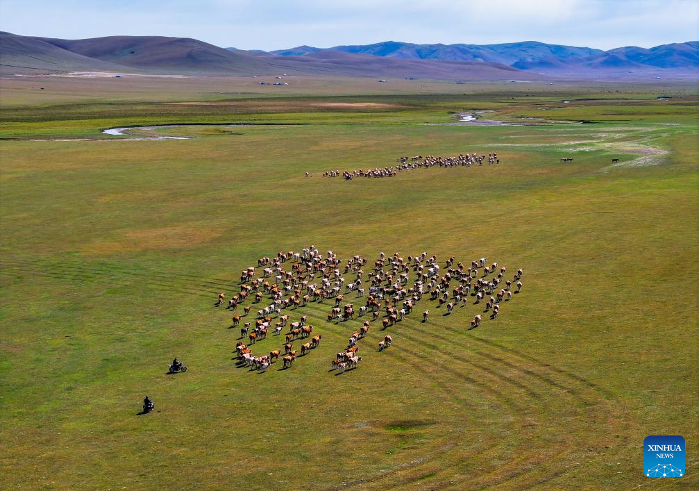 An aerial drone photo taken on Sept. 20, 2025 shows herdsmen transferring livestock on their way home in Baori Hushu Gacha of Gerquluu Sumu, Jarud Banner of Tongliao, north China's Inner Mongolia Autonomous Region.