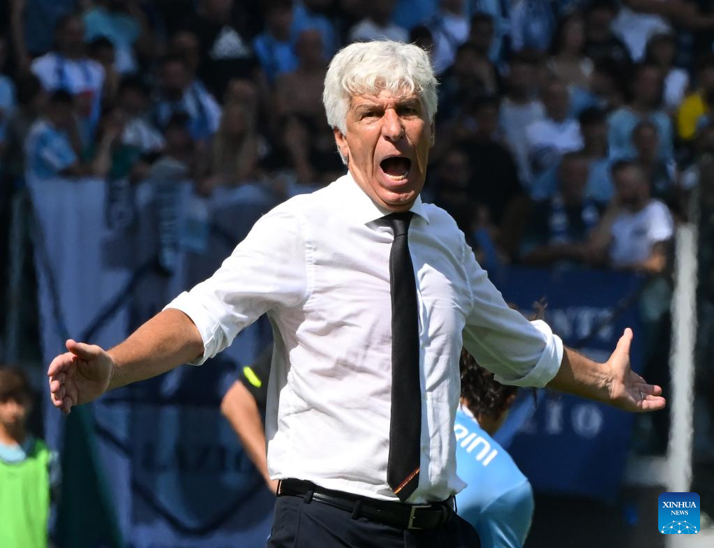 Roma's head coach Giampiero Gasperini reacts during the Serie A football match between Lazio and Roma in Rome, Italy, Sept. 21, 2025. (Photo by Alberto Lingria/Xinhua)