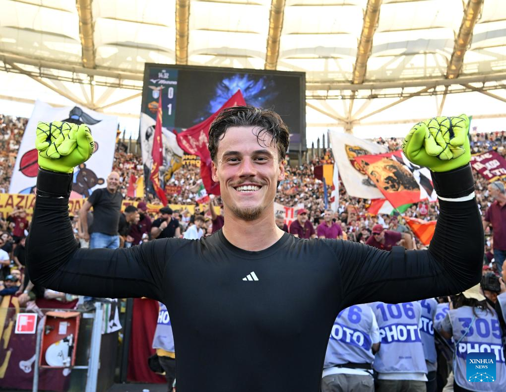Roma's Mile Svilar reacts after the Serie A football match between Lazio and Roma in Rome, Italy, Sept. 21, 2025. (Photo by Alberto Lingria/Xinhua)