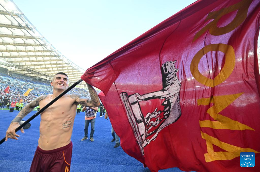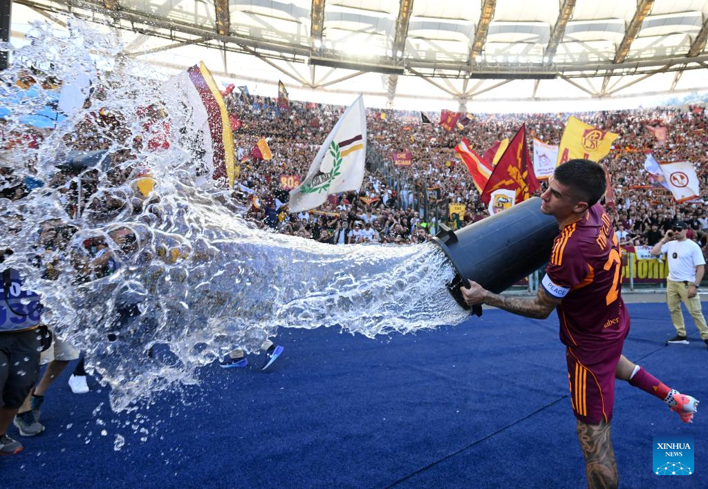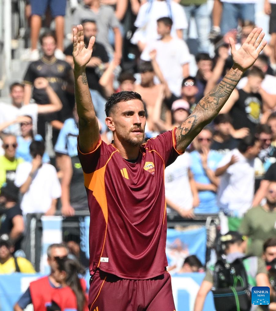 Roma's Lorenzo Pellegrini celebrates his goal during the Serie A football match between Lazio and Roma in Rome, Italy, Sept. 21, 2025. (Photo by Alberto Lingria/Xinhua)