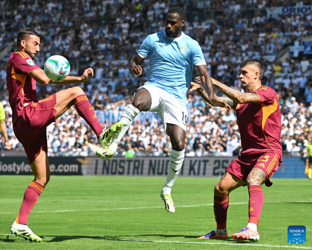Roma's Bryan Cristante (L) and Gianluca Mancini (R) vies with Lazio's Boulaye Dia during the Serie A football match between Lazio and Roma in Rome, Italy, Sept. 21, 2025. (Photo by Alberto Lingria/Xinhua)
