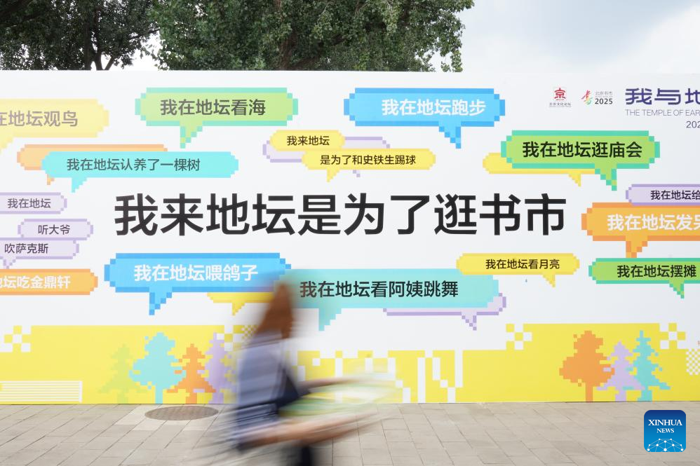 A visitor walks past the display board of the Beijing Book Fair 2025 at the Ditan Park, also known as the Temple of Earth, in Beijing, capital of China, Sept. 22, 2025. Themed "Read to Become a Better You," the 11-day Beijing Book Fair 2025 concluded at the Temple of Earth on Monday. (Xinhua/Dai Mingxuan)