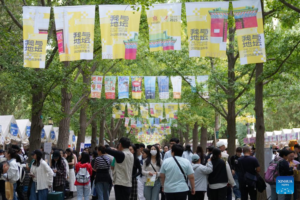 Visitors are seen during the Beijing Book Fair 2025 at the Ditan Park, also known as the Temple of Earth, in Beijing, capital of China, Sept. 22, 2025. Themed "Read to Become a Better You," the 11-day Beijing Book Fair 2025 concluded at the Temple of Earth on Monday. (Xinhua/Dai Mingxuan)