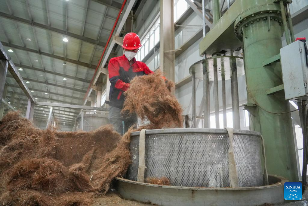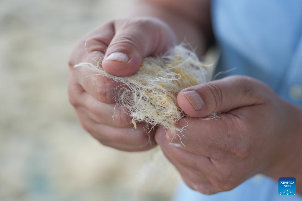A worker processes raw materials at a fiber degumming workshop of a garment company in Yuli County, northwest China's Xinjiang Uygur Autonomous Region, Sept. 20, 2025. Leveraging apocynum venetum's characteristics of drought resistance, salt and alkali tolerance, cold and heat resistance, wind and sand resistance, and strong ecological adaptability, local authorities of Yuli County, which is located on the edge of the Taklimakan Desert, have made efforts to curb desertification, promote employment and increase local people's income by developing the apocynum venetum industry. (Photo by Wang Zhipeng/Xinhua)