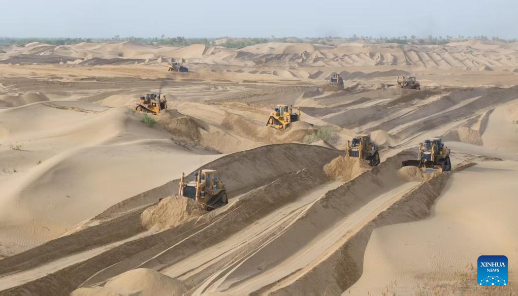 An aerial drone photo taken on May 22, 2025 shows large machinery leveling sand dunes at the desert prevention and control area on the south bank of the Tarim River in Yuli County, northwest China's Xinjiang Uygur Autonomous Region. Leveraging apocynum venetum's characteristics of drought resistance, salt and alkali tolerance, cold and heat resistance, wind and sand resistance, and strong ecological adaptability, local authorities of Yuli County, which is located on the edge of the Taklimakan Desert, have made efforts to curb desertification, promote employment and increase local people's income by developing the apocynum venetum industry. (Photo by Wang Zhipeng/Xinhua)