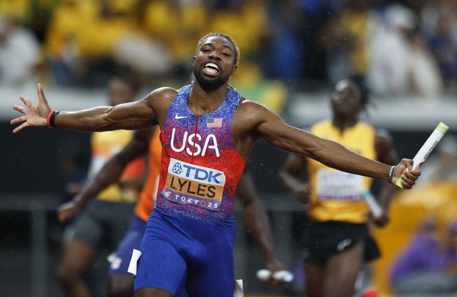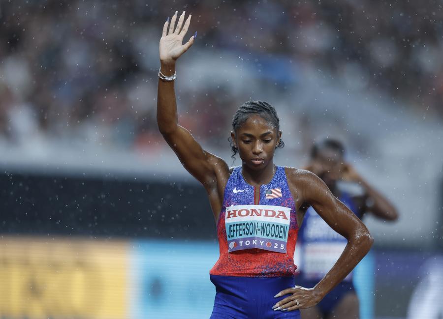 TOKYO, Sept. 21 (Xinhua) -- Melissa Jefferson-Wooden capped a dazzling campaign with her third gold medal on Sunday, guiding the United States to victory in the women's 4x100-meter relay on a rain-soaked final day of the World Athletics Championships.