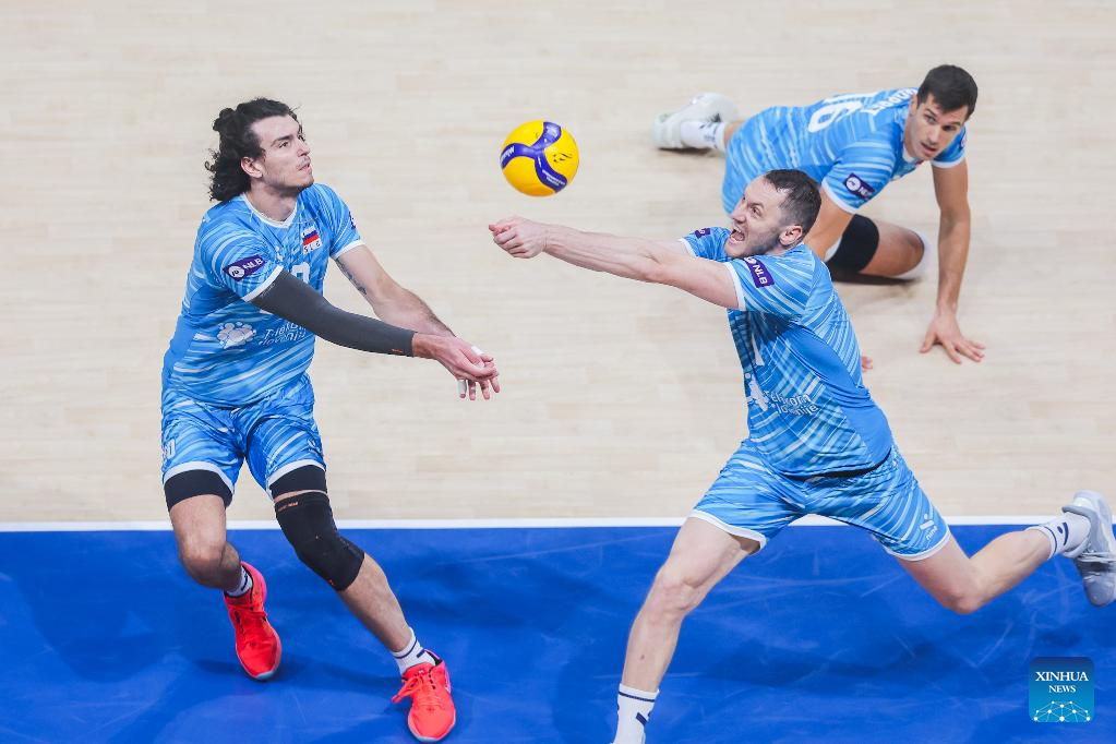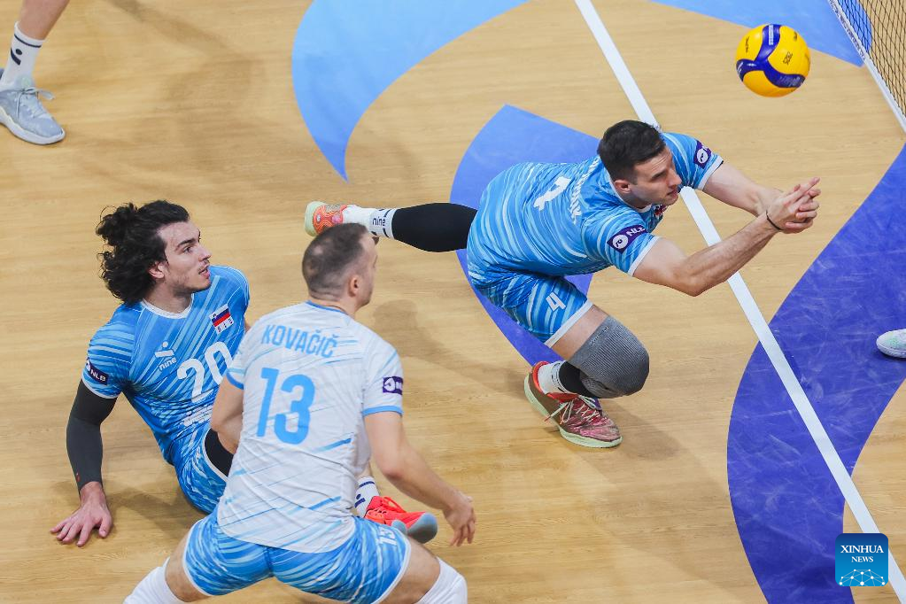 Players of Slovenia compete during the round of 16 match between the United States and Slovenia at the FIVB Men's World Championship 2025 in Pasay City, the Philippines, Sept. 22, 2025. (Xinhua/Rouelle Umali)