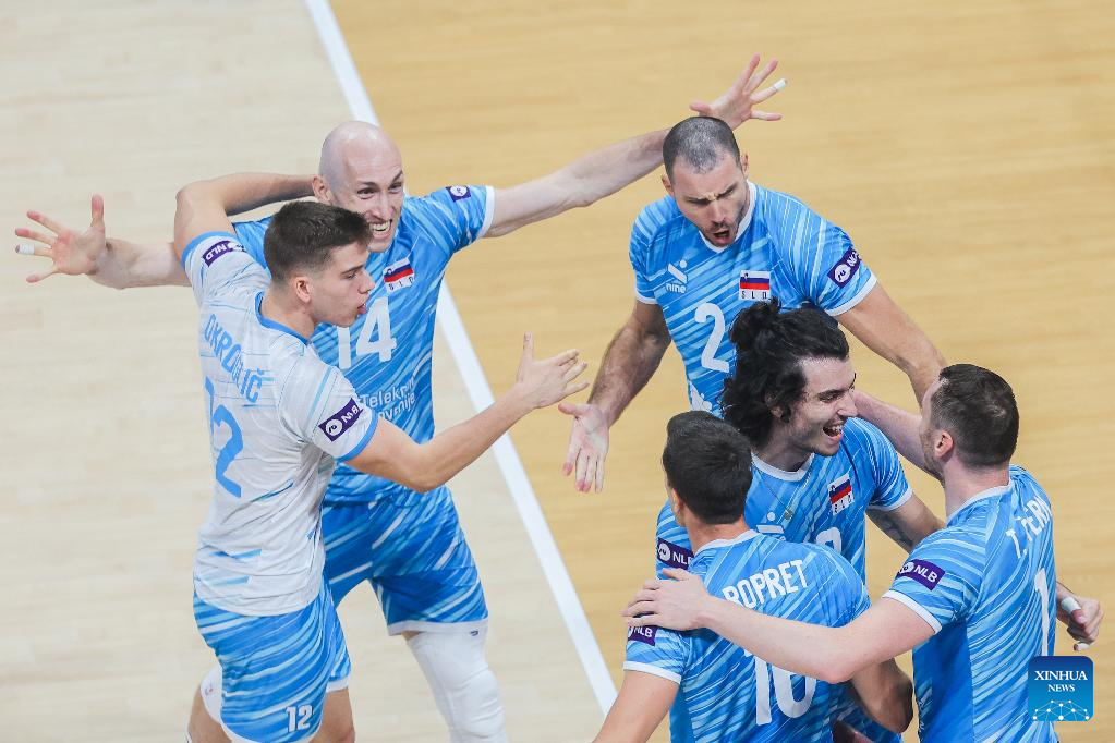 Players of the Slovenia celebrate after scoring a point during the round of 16 match between the United States and Slovenia at the FIVB Men's World Championship 2025 in Pasay City, the Philippines, Sept. 22, 2025. (Xinhua/Rouelle Umali)