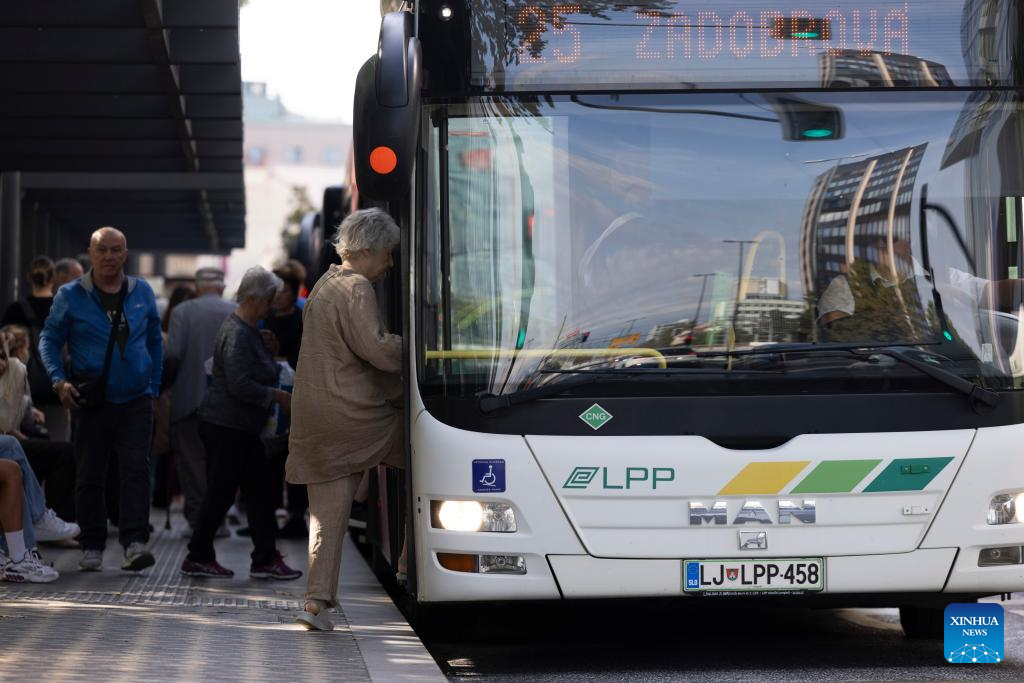 People use public transportation on World Car Free Day in Ljubljana, Slovenia, Sept. 22, 2025. (Photo by Zeljko Stevanic/Xinhua)