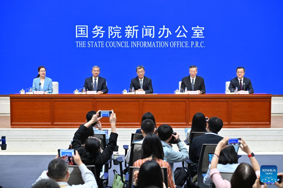 Chinese Minister of Education Huai Jinpeng, vice ministers of Education Wang Jiayi, Xiong Sihao and Du Jiangfeng attend a press conference held by the State Council Information Office (SCIO) on progress in accelerating the development of China into a leading country in education during the 14th Five-Year Plan period (2021-2025) in Beijing, capital of China, Sept. 23, 2025. (Xinhua/Li Xin)