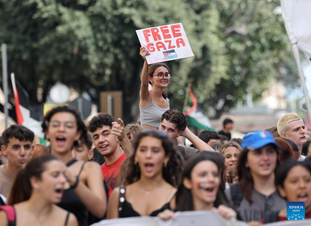 People participate in a pro-Palestinian protest in Rome, Italy, on Sept. 22, 2025. (Xinhua/Li Jing)