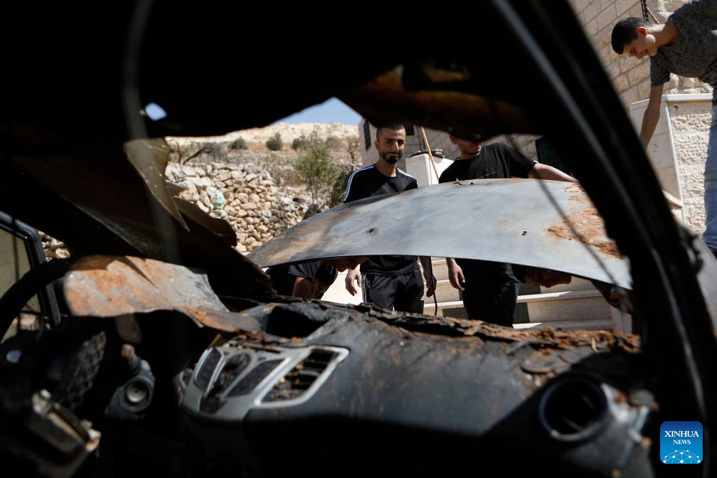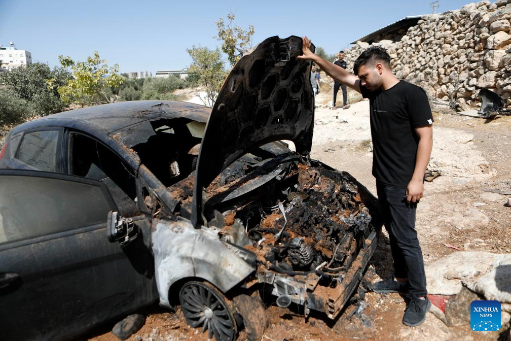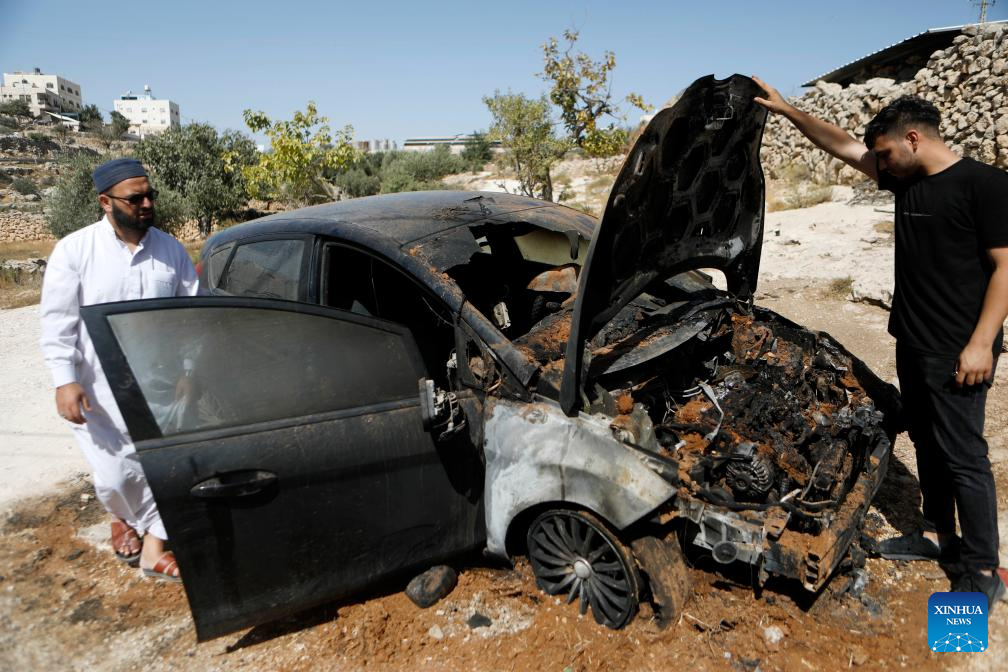Israeli settlers set fire to a Palestinian vehicle at night on Sunday in the southeastern area of Hebron. (Photo by Mamoun Wazwaz/Xinhua)