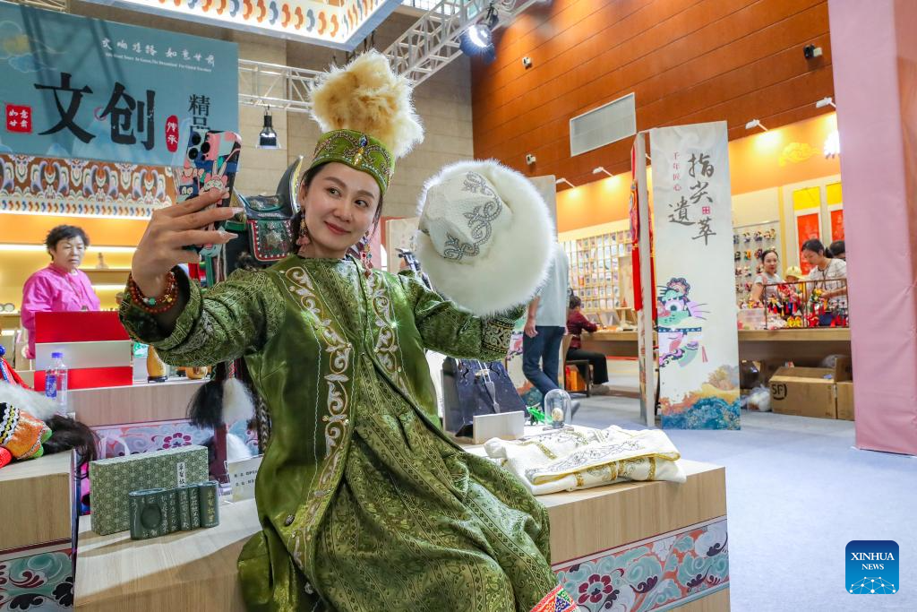 A visitor wearing traditional ethnic attire takes selfie at an exhibition during the 8th Silk Road (Dunhuang) International Cultural Expo in Dunhuang, northwest China's Gansu Province, Sept. 22, 2025. More than 1,200 representatives from 97 countries and eight international organizations have gathered at the 8th Silk Road (Dunhuang) International Cultural Expo, which kicked off on Sunday in Dunhuang, a key hub on the ancient Silk Road in northwest China.